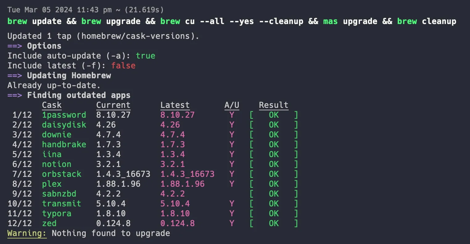 brew update && brew upgrade && brew cu --all --yes --cleanup \