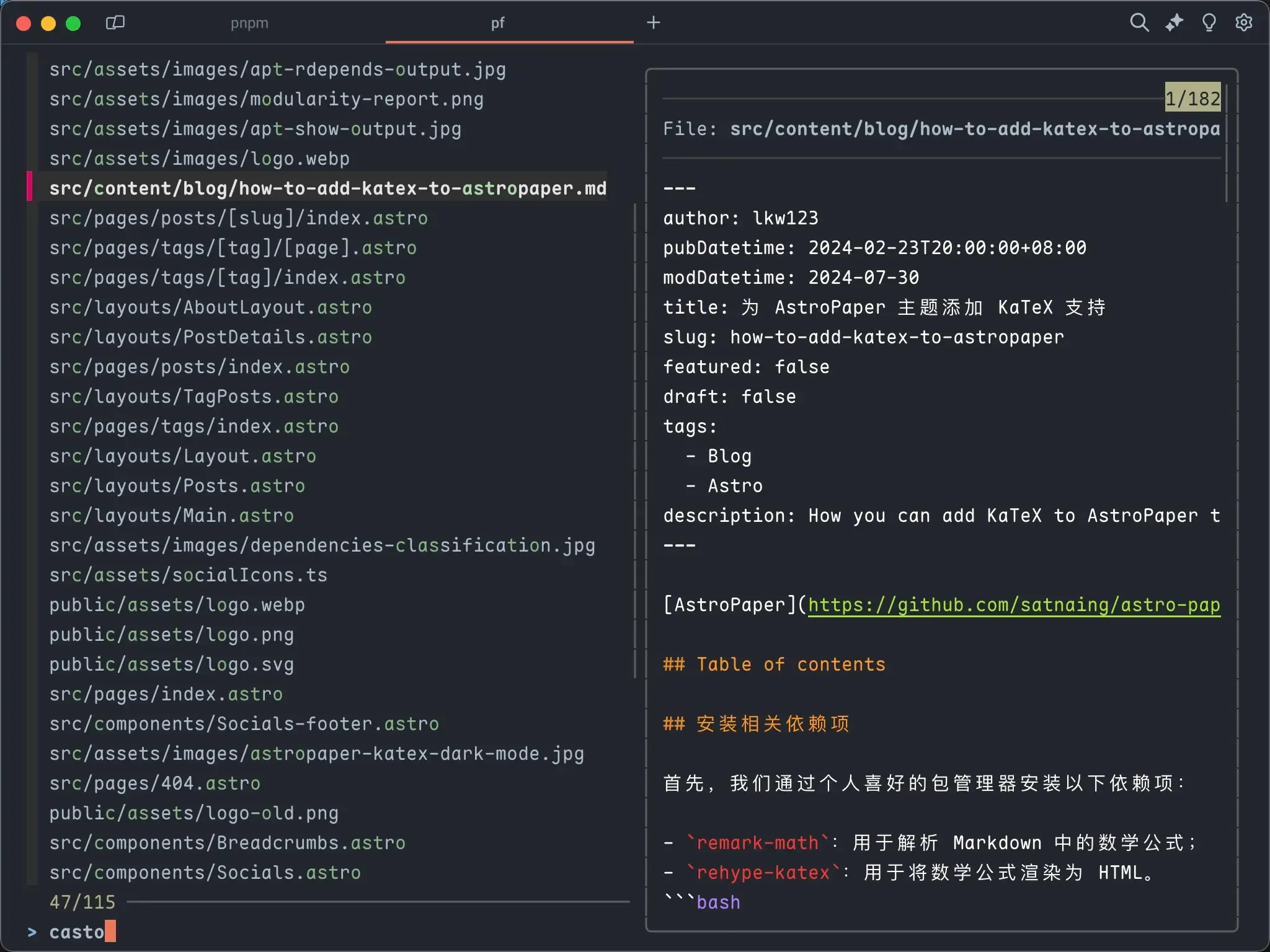 alias pf='fzf --preview='\''bat --color=always --style=header,grid --line-range \ :500 {}'\'' --bind shift-up:preview-page-up,shift-down:preview-page-down'如下图所示: