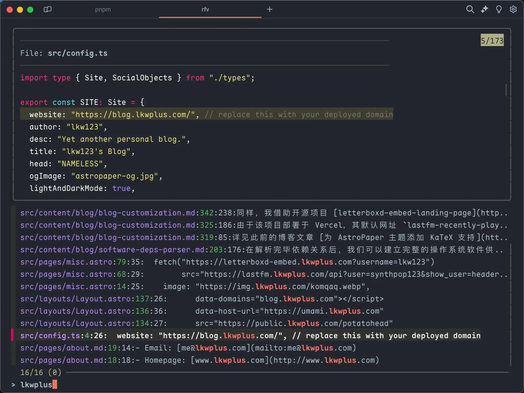 使用 rfv (ripgrep-fzf-vim) 函数进行全文内容搜索并在 Vim 中打开结果。搜索结果将实时展示在 Fzf 窗口中,并通过 Bat 预览文件的相关内容。绑定按键 Enter 键和 Ctrl+O 键以实现在 Vim 中打开搜索结果,便于进行进一步的编辑。