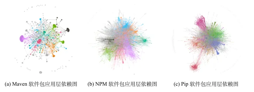 在实现应用层包管理器的依赖声明文件解析器后,本文完成 Ubuntu 22.04 应用层软件包的依赖项的提取。进一步的,本文对所有操作系统软件包中引入了这些包管理器软件包的部分构建依赖关系图,以直观呈现应用层软件包间的供应链。其中,Maven、NPM、Pip 软件包应用层依赖图如下图所示: