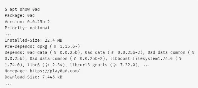 apt show 同样也可用于显示特定软件包的信息。与前一种方案相比,其仅能给出软件包的正向依赖,而无法解析反向依赖,但 apt show 可以提供除依赖项之外的源包的更多的相关信息,如描述、版本、大小、维护者信息等。