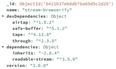 这些方法殊途同归,我们采用 read-package-json 实现解析任务。以软件包 node-stream-browserify 为例,解析结果如下图所示:
