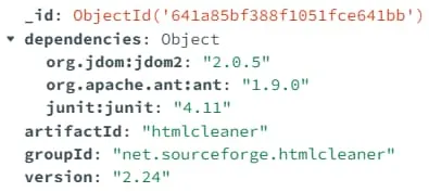 xml.etree.ElementTree 是 Python 标准库中的一个模块,它提供了一种简单而高效的方法来解析和操作 XML 数据。本文借助该模块首先对项目的基本坐标进行解析,并提取 dependencies 标签中的所有内容,对于其中的各个 dependency 项逐个提取依赖的基本坐标,从而完成对于 Java Maven 依赖声明文件的解析。以软件包 libhtmlcleaner-java 为例,解析结果如下图所示: